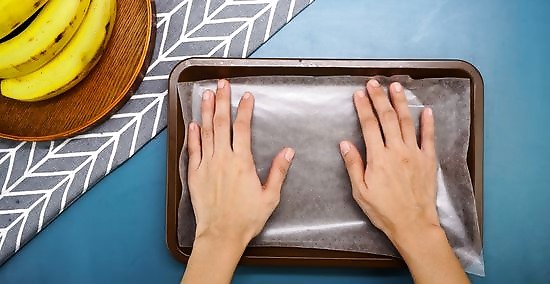 Cover at least 1 baking tray with parchment paper. Rip or cut a sheet of parchment paper that’s large enough to fit over the surface of your baking tray. Line the tray with a sheet so your bananas can dry without sticking the pan. If you’re drying a lot of banana chips, you may need more than 1 baking tray to get the job done. Double-check the dimensions of your baking tray to make sure it can fit in your oven.