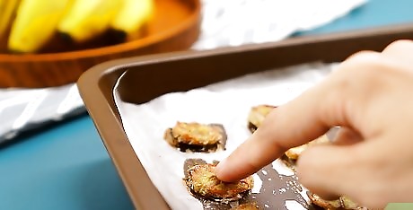 Flip over the banana slices with a spatula when they’re brown and crisp. Set a timer for 5 hours so you remember to monitor and turn over your bananas. When your chips look brown and crispy, flip them over with a spatula. If the bananas still look moist, continue checking on the fruit until it looks visibly dry on the surface. Feel free to flip your bananas over earlier if they look crisp enough.
