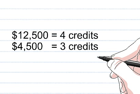 Divide your earnings to find your credits earned. Social Security credits are, essentially, accounting units. A specific amount of money (which changes every year) equals one credit. You may earn up to 4 credits in any given year. For 2017, you receive one credit for every $1,300 you earn. For example, if you earned $12,500 in 2017, all of which was covered by Social Security, you would earn 4 credits for the year. On the other hand, if you only earned $4,500 in 2017, you would only earn 3 credits. You need to earn at least $5,200 to earn the full 4 credits.