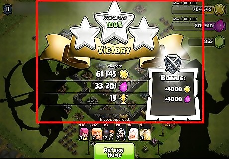 Claim your reward. If you earn at least one War/Raid star, you’ll instantly win the fight and will be awarded Gold and Elixir bonuses, which will be saved on your Gold and Elixir Storages.
