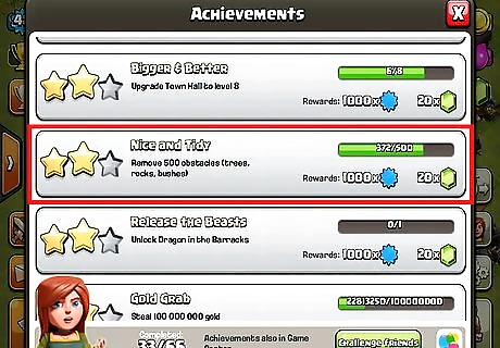 Complete the achievement. Achievements are divided into three levels. You gain one star for every level of an achievement you complete. In example; in “Bigger Coffers,” you get your first Achievement star once you upgrade your Gold Storage to level 2, then the next start when it reaches level 5, and then the last Achievement star will be awarded once the Gold Storage reaches level 10.