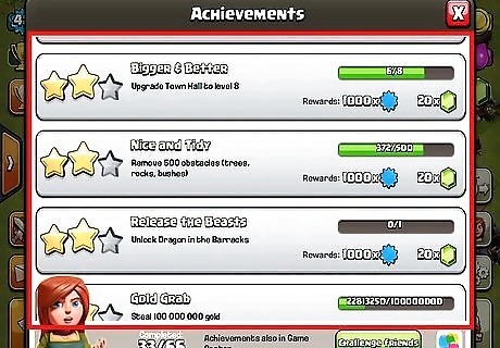 Tap the Achievement button on the bottom right-hand corner of the game screen. This is the small button with a woman’s face. The Achievements window will open, which shows a detailed view of your progress for every challenge. Achievements are special challenges that give Gems as a reward when you complete it.