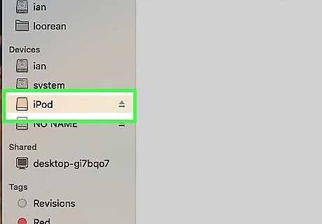Click on your iPod. It appears under the "Devices" section on the left side of the Finder window.