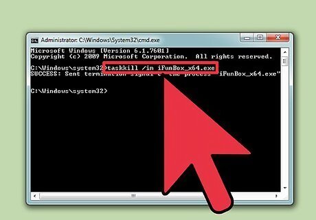 Terminate the program. Type taskkill /im filename.exe into the Command prompt and press ↵ Enter. Replace 'filename' with whatever the title of the program is. For example, if you were trying to close iTunes, you would replace it with 'iTunes.exe'.