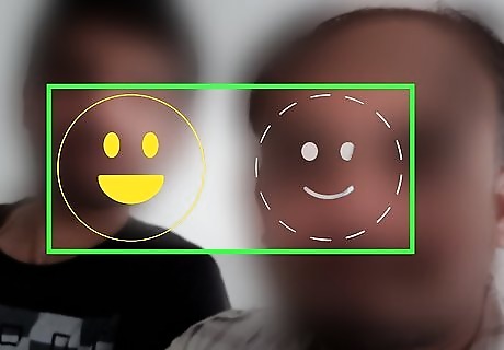 Line up your faces with the two smiley face overlays. Hold your phone so that you and the other person are lined up in the smiley faces on the screen. They'll both turn yellow when you're in the right spot, and then your faces will be swapped automatically. Any movements you make will be with the simulated face. So when you open your mouth, your friend's simulated face on your head will open its mouth. You can use this to make your friend make a face they normally wouldn't! Users have reported getting this to work with near-to-life faces as well, such as detailed statues. Give it a try with a statue or painting nearby and see what happens!
