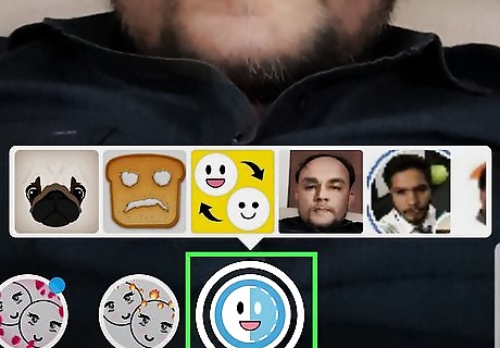 Select the yellow Face Swap Lens effect. Swipe through the available Lenses until you reach the end of the selection. You'll see the yellow Face Swap option towards the end of the selection. It has a picture of two smiley faces with arrows between them. The purple Face Swap option will allow you to swap with a picture stored on your device. See the next section for details.