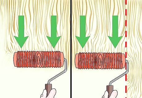Go over the painted area with the wood grainer. After you’ve painted your first small area, use the wood grainer to imprint the paint with the wood pattern. Place the grainer at the top of the section, press the grainer into the paint with gentle but even pressure, and drag the grainer down a strip of paint in a straight line. When you’ve finished the first strip, go back to the top of the section, align the grainer immediately beside the first strip, and drag the grainer down the second strip. Repeat until you’ve imprinted the entire section with the wood grainer.