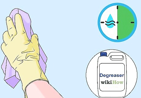 Clean the surface with a degreaser. It’s a good idea to use a degreasing cleaner to clean any surface before painting. This will remove all traces of oil, grease, grime, and dirt, and give the paint a clean surface to stick to. Dip a scrubbing pad or sponge into a degreasing cleaner and wipe the entire surface. Rinse the area with a damp sponge, pat it dry with a rag, and let the surface dry for 30 minutes. Denatured alcohol, isopropyl alcohol, and ammonia-based household cleaners are all good degreasing cleaners. You can also use ½ cup (4 ounces) of trisodium phosphate mixed with 2 quarts (1.8 L) of water as a powerful degreasing cleanser.