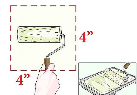 Apply a coat of paint to a small section. Saturate your roller in paint. Roll the roller over the paint tray a few times to remove excess. Working in a small area, apply a thin but even coat of paint to your surface. If necessary, use a brush to access corners, joints, recesses, and awkward areas. To stop the paint from drying too quickly, work in sections that are no bigger than 4-feet squared (1.2-meters squared). Once you’ve painted and imprinted a section, you can move on to the next.