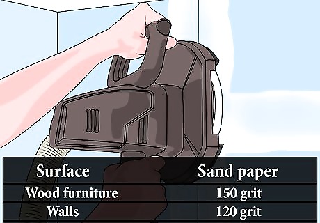 Sand the surface. Sanding before painting is important no matter what kind of surface you're working with, because it cleans and roughs up the surface so the paint can stick. Using an orbital sander will make the job go much faster, but you can sand smaller surfaces by hand with a sanding sponge. For countertops and wood furniture, use 150-grit sandpaper For doors and metal, use 220-grit sandpaper For walls, use 120-grit sandpaper For cabinets, use 100-grit sandpaper