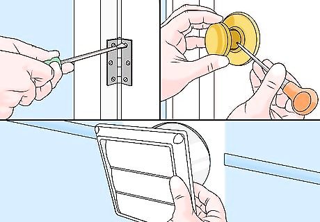 Remove hardware. The type of hardware you're dealing with will depend on what you're painting. Items like walls, furniture, and doors will likely have hardware that you have to remove. Remove the hinges from doors and cabinets before painting. Use a screwdriver to remove the screws attaching the hinges, and then take the doors or cabinets down. Remove handles, knockers, mail boxes, and other attached accessories from doors, cabinets, furniture, and other items. For walls, take everything off the walls and remove vents, switch plate covers, outlet covers, and other items.