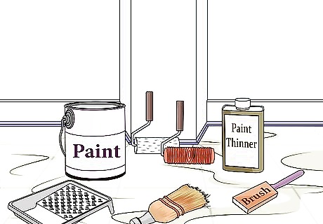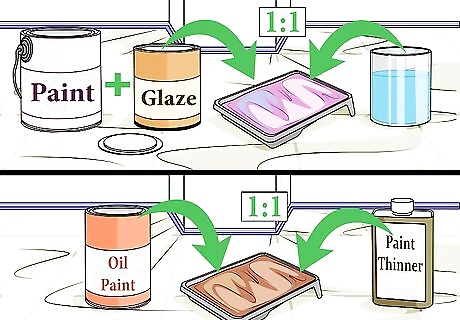Thin out your paint. To create a faux bois finish, you have to paint the surface first and then use a wood grainer to mark a wood pattern into the paint. Thinning out the paint prevents the paint from drying too quickly, and makes it easier to press in the pattern. If you're using a latex paint, mix it in the paint tray with equal parts glaze and water. For oil paint, mix the paint with one part paint thinner.