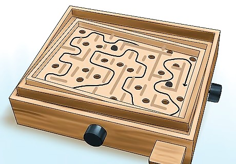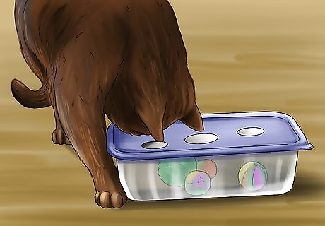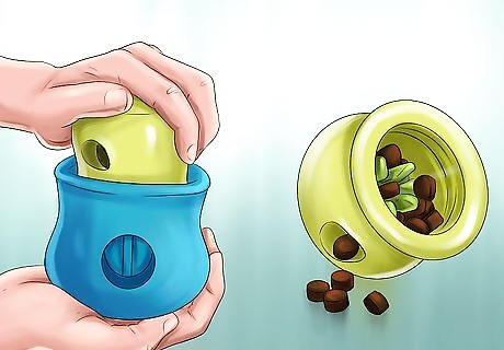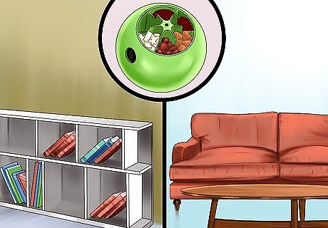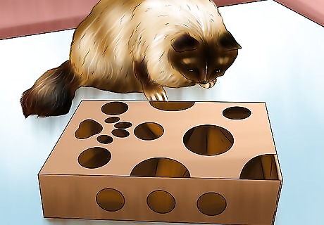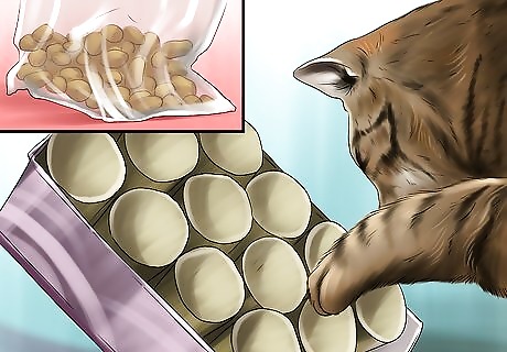 Mix other objects with food. Another way to increase the challenge and keep your cat engaged it to mix other objects—such as ping pong balls, little toy mice, or other cat toys—with the food in the puzzles. This way, your cat might not receive a snack every time they get something out of the toy.