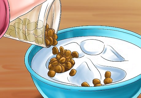 Fill puzzles with food. Place your cat’s favorite dry food and/or treats in the puzzle, and place the puzzle in plain view. In the beginning, it is important for you to keep puzzles at least half full. This will make it easier for your cat to get the food out, and help them stay interested in the puzzles.
