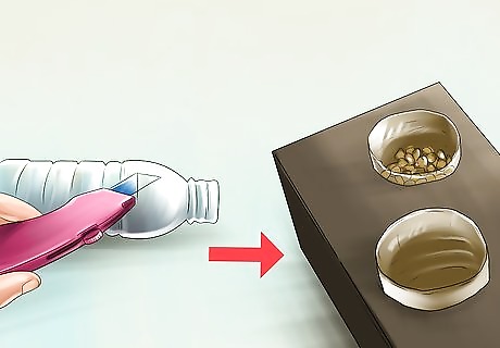 Use a water bottle. You can create a DIY cat puzzle very simply using a plastic water bottle. The added benefit to using the water bottle is that it makes a funny sounds that cats seem to enjoy. Use an X-acto knife to cut holes in a plastic water bottle, just larger than the food/treats. Fill the bottle with food/treats. Tightly close the lid.