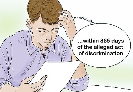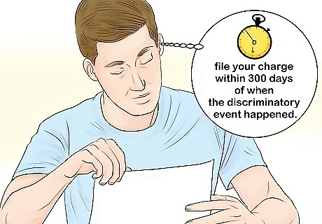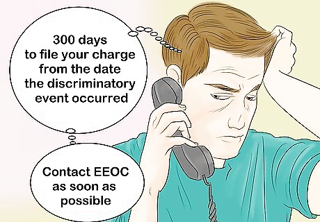 Mark your deadline to file your federal charge. Because there are strict deadlines, if you suspect discrimination you should contact the EEOC as quickly as possible after the event takes place. In most cases you have 300 days to file your charge from the date the discriminatory event occurred.