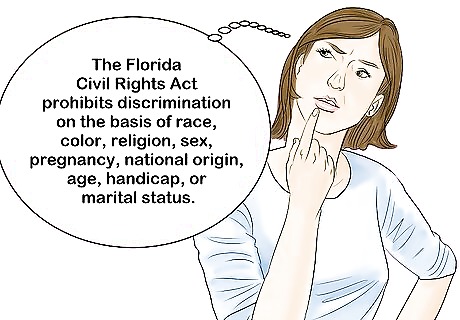 Determine whether your experience constitutes unlawful discrimination under Florida law. The Florida Civil Rights Act prohibits discrimination on the basis of race, color, religion, sex, pregnancy, national origin, age, disability, or marital status. For example, employers cannot post a "help wanted" ad that indicates a preference for job candidates of a certain race or gender. Employers also are prohibited from preferring employees for promotions or benefits over others on the basis of race, color, religion, sex, pregnancy, national origin, age, disability, or marital status, or for depriving others of benefits or work for those reasons.