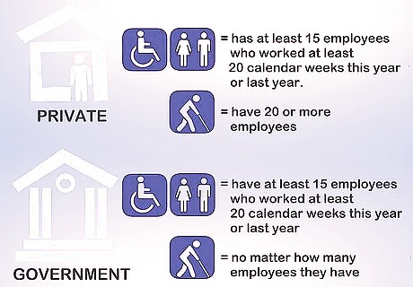 Find out if your employer is covered by federal law. Employers must have a certain number of employees to be come under the federal laws. The number of employees required depends on the type of employer and the kind of discrimination alleged. A business or private employer is covered by the federal anti-discrimination laws involving discrimination on the basis of race, color, religion, sex and pregnancy, national origin, disability, or genetic information if it has at least 15 employees who worked at least 20 calendar weeks this year or last year. If your complaint involves age discrimination, the business must have 20 or more employees. In contrast, nearly all private employers are covered by the Equal Pay Act. State or local governments are covered by the laws enforced by the EEOC if they have at least 15 employees who worked at least 20 calendar weeks this year or last year. They are covered under the age discrimination and equal pay laws no matter how many employees they have.