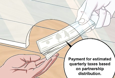 Pay estimated quarterly taxes based on partnership distribution. Even if you're filing taxes for your LLC as a partnership, you still must pay estimated quarterly taxes if you expect to owe $1,000 or more in taxes for the year. Use IRS Form 1040-ES to estimate your tax liability. Remember to divide estimated profits according to the profit distribution you have determined with your partners. For example, you own an LLC with 3 other partners. The 4 of you have decided to split profits evenly. When you estimate monthly profits, put 25 percent of that amount in your Form 1040-ES to calculate your tax liability estimate.