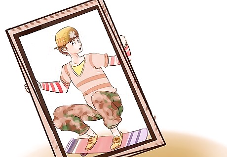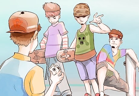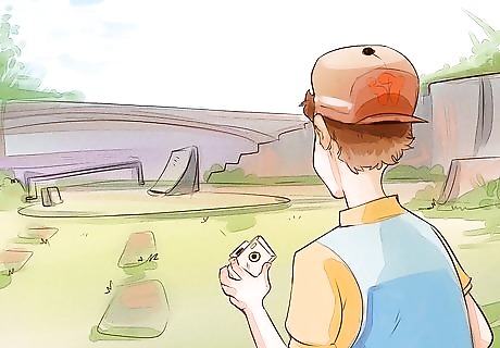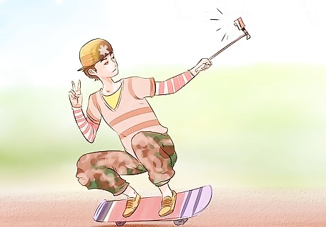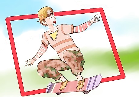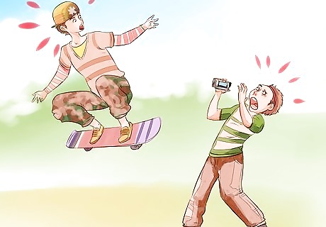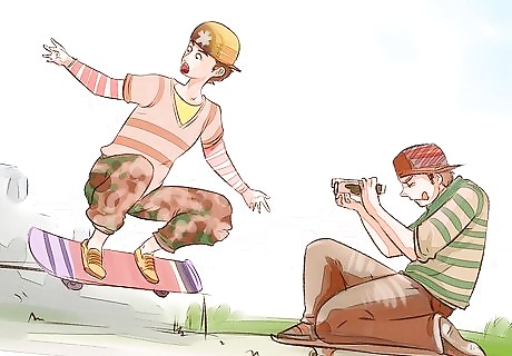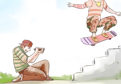 Focus on your own skating. If you're the designated camera-person, make sure that you focus on your own skating and stay safe, regardless of who you're filming or how many skaters you're filming. Don't look through the camera lens and pay too much attention to your camera work, focus on staying on your board and balancing. If you're filming yourself, consider setting up your camera on a tripod. Mark the spot on the concrete that's the center of the frame with sidewalk chalk, so you'll know where to pull your trick. If you're skating and filming others, don't try to get too fancy with your footwork while you're doing it. Just focus on smooth skating and keeping the camera steady to give their tricks the camerawork they deserve.