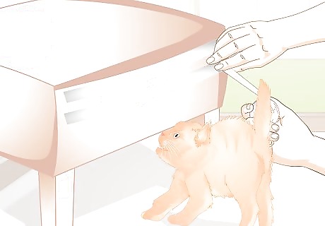 Get your cat a scratching post. This can be a simple post or an elaborate cat tree. You should make sure it is at least 3 feet high. Most cats enjoy stretching will scratching. Whichever you choose, make sure to choose a good spot. Place it near something your cat currently likes to scratch. Try adding some catnip on the post for an extra sensory experience. Scratching posts are also great for keeping your cat's nails filed down naturally, which is an effective method of preventing painful scratches. If your cat is very young, get it a scratching post or board right away. Teaching the kitten that it should only scratch in allowed areas is important in order to discourage bad behavior in the future. Try rewarding the cat or kitten for scratching where it is allowed.