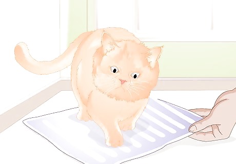 Buy a scratching pad. Your cat may prefer a simple pad to a post. If your cat seems to like scratching carpet, look for a pad that has that as a covering. Corrugated cardboard is another popular material for scratching pads. Scratching pads are generally less expensive than posts. They also take up less space. Give your cat positive encouragement for using the pad. Try saying, "Wow, good kitty! Great job!". Use an upbeat, soothing tone of voice.