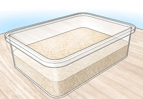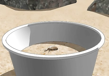 Fill your environment with fine substrates such as sand or sugar. Antlions can survive in any environment, though sand and dirt is its natural home. Filter out your substrate, especially if you’re using anything that may have rocks or clumps of dirt. Antlions can remove any large blockages, but it will be easier for them to have a smooth and consistent place to live. Fill your environment about halfway with sand. Make sure the antlion is not smothered by the sand and has enough space to build a pit. Make sure the diameter across the level of the sand is at least 4 inches. This will make sure your antlion has enough space to build their pit.