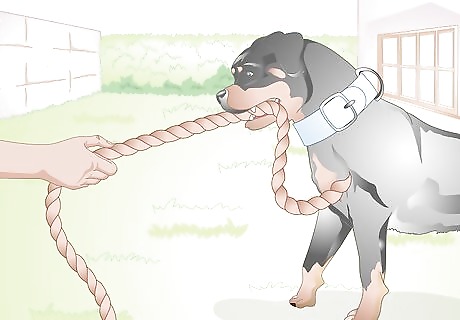 Look at durable rope toys. Many dogs enjoy playing with rope toys, especially for games like tug of war. The fibrous materials of the rope, which are usually nylon or some other synthetic fiber, are strong enough to withstand a lot of chewing. Generally, rope toys with more threads are stronger. Rope toys can also be cleaned fairly easily. The fibrous materials are also good for cleaning your dog's teeth.
