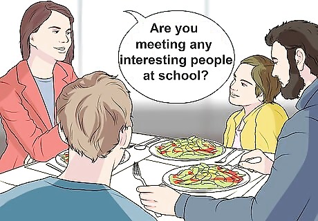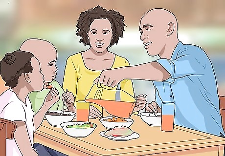 Encourage conversation. Family dinners are a great time to bond, and if your family enjoys the meals, they’re much more likely to stick to the meal schedule. Try to come up with interesting topics for discussion. If the children don’t answer right away, you can start discussion by giving your own answer. You might try asking: If you could go anywhere in the world, where would it be? Are you meeting any interesting people at school? Have you had any interesting dreams lately? If you had a superpower, what would it be? If you could meet anyone from history, who would it be? If you could have any animal in the world as a pet, which one would it be?