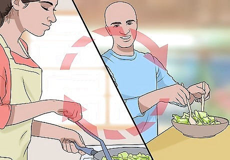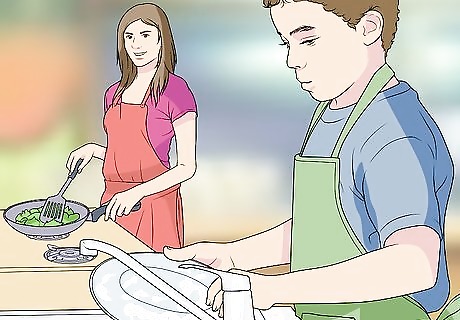 Assign different tasks to family members. Preparing dinner together not only saves you time but it teaches children important responsibilities. Choose tasks that are developmentally appropriate for your child. Include your partner to also help out to foster a family atmosphere. Young children (under the age of six) may be able to help set the table, wash dishes, and help stir ingredients. Older children (ages six to twelve) may be able to wash vegetables, stir pots (if supervised), pour water, set out serving dishes, and clear the table. Teenagers should be able to help you with most aspects of cooking and cleaning.