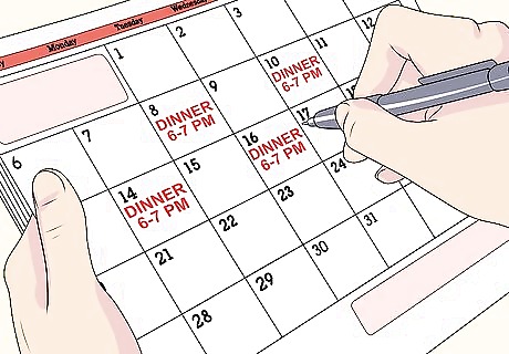 Write dinner into your calendar. With work, sports, homework, and other responsibilities, dinner may not be a priority. To help make it one, set off an hour or two for dinner in your calendar. Try not to let any other activities interfere with this time. Try to aim to have dinner at the same time every day. You can of course adjust this schedule if something pops up, such as sports practice or a late day at work. If you plan on cooking fresh meals every day, you may want to build in that extra cooking time into your schedule.