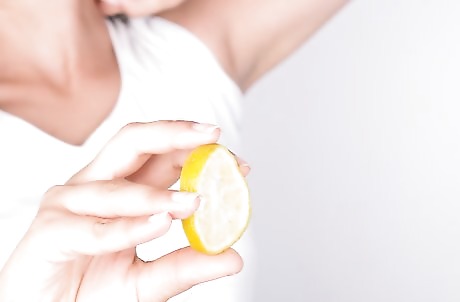 Scrub underarms with lemon. Cut a lemon in half and remove the pips. Gently rub your underarms with one of the halves to cover odor and clear your pores. Do this in the shower and rinse your underarms afterward.
