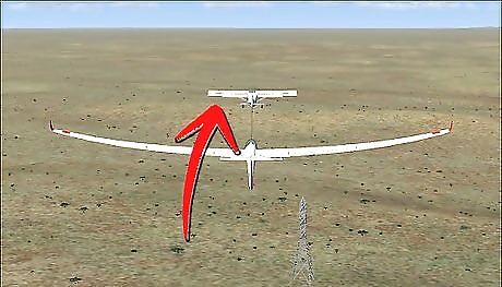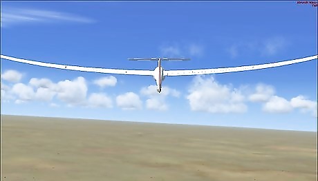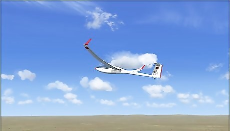 You will hear a high-pitched beeping sound when you take off. This is the variometer instrument. It tells you when you are climbing or descending. If the sound is high pitch, the glider is rising in a thermal. If the pitch of the sound is low, you're losing altitude. Go into a shallow dive and look for places with puffy clouds above you, or fly above buildings, houses or any other structures, until the pitch goes up and you start climbing. Fly tight circles to stay inside the thermal and climb until it runs out, then repeat as necessary to stay aloft.