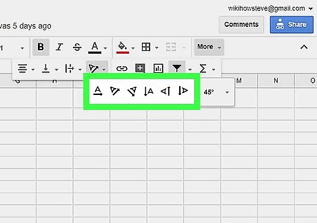 Click the Text Rotation icon. It’s the “A” with an arrow beneath. This brings up a list of options for rotating the text.