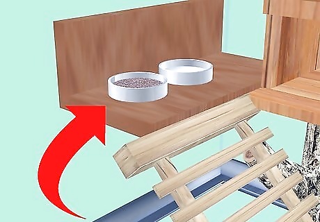 Glue/position any permanent fixtures. Since water and food bowls on the floor are at risk of being contaminated, you may want to add wooden ledges near the top of your enclosure. If so, make sure you spray a few coats of Plasticote or similar pet-friendly substance to make cleaning easier. You may also want to add some hooks or fasteners to the side of your vivarium to aid in hanging items.