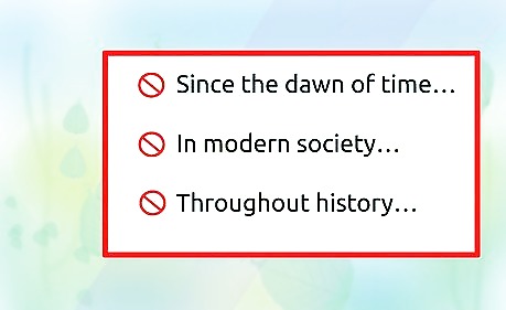 Avoid cliches and wordy or awkward phrases. Cliches are expressions that have a non specific meaning or have lost significant meaning over time. These are overused phrases that are so familiar, they do not create a specific or unique meaning. For example, “the grass is always greener”, “there's no “i” in team”, “work hard, play hard.” To make your essay stronger, resist the urge to throw in cliches to get your point across. Be specific and use your own words to discuss your paper topic. Your teacher will want to read your original thoughts and ideas, not familiar phrases or sayings. Rather than start your paper with a cliche like, “Since the dawn of time…” or “In modern society…” or “Throughout history…”, create an original opening or use a quotation from a source. Awkward or wordy phrases are usually phrases that run more than two lines on the page. Instead of cramming in all your ideas in one sentence, break up the sentence into shorter sentences. This will help you eliminate any wordy sentences or phrases that seem awkward and hard to understand.