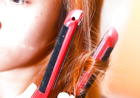 Clamp your hair. Start about an inch down from the root and place the iron in the hair. Don't clamp down just yet because this will create a crease. Rotate the iron and pull, then close the iron as you finish pulling the iron along the strand of hair. There's no need to twist the iron, just pull down along the section of hair. The flat iron should be vertical when making the curls, with the end towards the ceiling. Bend the iron away from your face as you curl. Don’t go all the way to the ends of your hair; stopping a half or 3/4 of an inch before you get to the bottom will help you to achieve that messy, just-got-out-of-the-pool look. An alternate way to make a curl with a flat iron is to twist a small strand of hair around your finger until you get to your head. Remove from your finger and take that twist of hair and press it between the flat iron for about 10 seconds. Release for a curl.