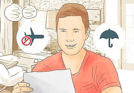 Decide what type of insurance coverage you need. There are several different types of insurance, and some insurers will bundle all of them in a comprehensive “travel insurance” package. Consider the following types of coverage: Trip cancellation. This insurance reimburses you for your pre-paid, non-refundable expenses if you need to cancel before you depart. Trip interruption. This insurance will cover you if something happens after you leave home that causes your flight to be interrupted. For example, you might become sick during your trip and miss your flight home. Trip delay. This insurance reimburses you for meals and accommodations if your trip's departure or return is delayed for a covered reason. Missed connection coverage. This insurance helps you if you missed a connecting flight. Baggage delay. This insurance will reimburse you for essential items if your bags are delayed for 24 hours.
