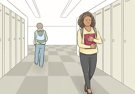 Keep moving when you run into each other. When you do run into your ex at school, you don’t want to be rude or mean, but you also don’t need to stop what you are doing to have a chat with them. To protect yourself from hurt feelings or awkward conversation with your ex, you can just say hello or smile at them as you pass by—and then keep walking. If your ex has been mean to you or the breakup has been super awkward, just avoid eye contact and keep moving. You don’t have to say hello or be pleasant unless you want to.