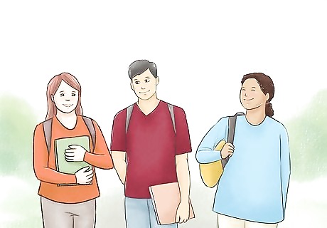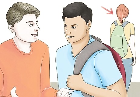 Use the buddy system to avoid awkward conversations. If the breakup is really new, you are probably dreading seeing your ex at school. To make it a little easier and less awkward, try to be with a friend or group of friends in places that you know you might run into your ex. For example, if you know you always run into them in the hall between 3rd and 4th periods or you share the same lunch period, try to make sure you are talking with and surrounded by friends during that time.