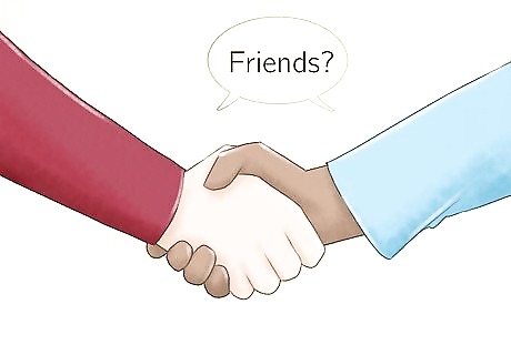 Talk about whether or not you both still want to be friends. The best way to keep things civil between you and your ex—even to become friends afterward—is to have an open and honest conversation about what you both want your interactions to look like, going forward. If you want to remain friends, tell them. If you don’t, that’s okay, too—but you need to be clear about that. For example, do you have a project coming due at school that you were working on together? You can discuss how it will be awkward at first, but you can push through it. Or, if you don’t think you can, agree to ask the teacher for new partners. Neither of you should have to give up friends because of the breakup. Talk with your ex about how it might be weird at first to hang out together with your friends, but over time, it will become easier.