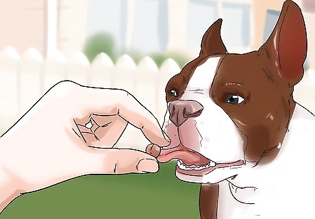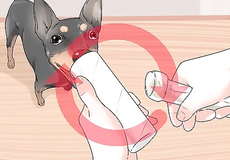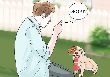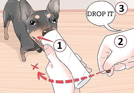 Teach your dog a release cue. Use a non-valuable yet interesting item, such as a paper towel roll, to teach your dog to release an object on command. Hold onto the item and move it around to entice the dog. Continue to hold onto one end of the item once the dog grabs it. Then using your other hand place your dog’s favourite treat under its nose and say “drop it.” The dog will likely let go of the object in order to take the treat. Once the dog has finished the treat give the dog the object again and repeat the command. This demonstrates that when they let go of the object they are rewarded with an even better item (the treat). It also teaches the dog that they can have the object back after taking the treat.