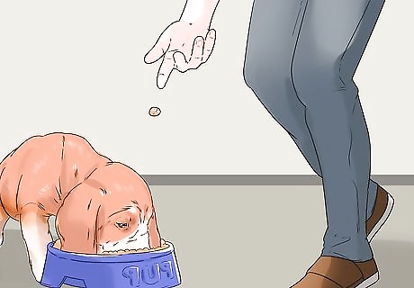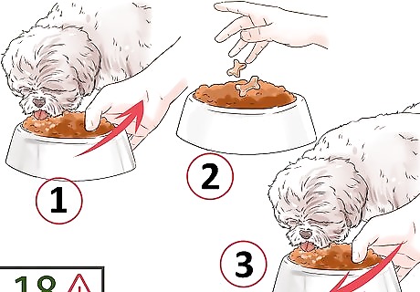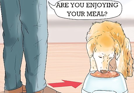 Stand over the dog and drop a treat in its bowl. Try standing directly over top of your dog’s bowl while it is eating and drop a treat into the bowl. Once you have dropped the treat into the bowl, turn around and walk away. You are slowly getting your dog more comfortable with you around during mealtime. Your dog is also learning that you provide a positive treat. Talk softly to your dog as you approach the bowl. Stand as close as you comfortably can to the dog's bowl. If he growls, withhold the treat. If he lets you stand there, provide a high value reward, such as your dog's favorite meat.