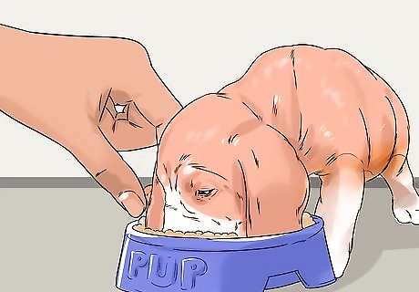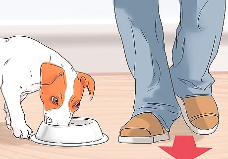 Add treats to your puppy’s bowl while they eat. Slowly approach your puppy’s bowl while they are eating and drop a treat into the bowl. Use a treat that is more appealing than the food they are currently eating, such as chicken or beef. This will help the puppy associate people approaching their bowl with a positive treat.