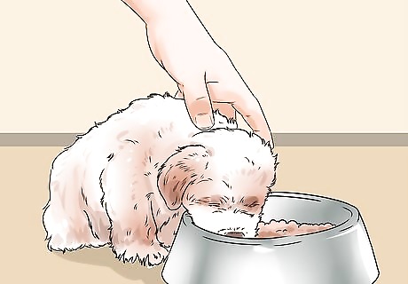 Touch your puppy while it is eating. When you are hand feeding your puppy, use your other hand to pet your dog. This will get them comfortable with you around and they will not get nervous or aggressive in the future.