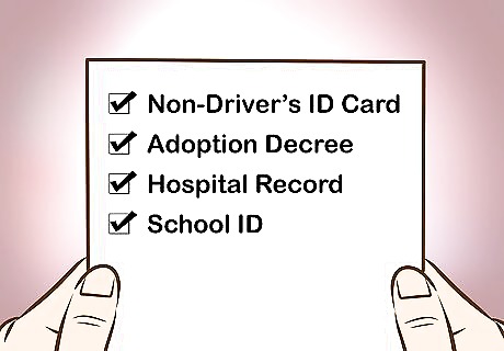 Provide the necessary documents. In addition to verifying your own identity, you will need to provide documents to prove your child's identity and date of birth. A birth certificate, while required, is not enough to confirm the identity of the child, and additional documentation is necessary to verify that the child has continued to exist beyond the date of birth. Acceptable documents to identify your child include: a state-issued non-driver's ID card for the child an official adoption decree a record from the child's doctor, or from a clinic or hospital, verifying that the child has been given medical attention after birth a religious record (like a baptismal certificate, for example) a record of the child from a school daycare center a school ID card
