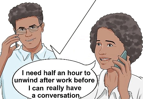 Be as specific as possible. Saying something like, "I need space" can be confusing. Instead, work on giving specifics. Express how much space you need and when you need it. Instead of saying, "I need time to myself after work," strive for specifics. For example, "I know you miss me during the day, but I need half an hour to unwind after work before I can really have a conversation. Can you give me that time to myself when I get home?" You can also ask the other person for specifics, so you understand their need for space. For example, "I know you like to have some time to yourself on the weekends. How much time do you need? Is there any way I can tell when you do and don't want to talk?"