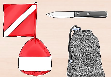 Gather your supplies. If this is your first time going scalloping, there are a few essential items you may need to pick up from your local dive or tackle shop: Dive flag. It is always recommended, and often required by law, to post a dive flag on your boat while snorkelers are underwater so that other boats can steer clear. Drawstring mesh bag to collect scallops as you go. Small paring knife for opening and cleaning the scallops.