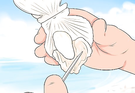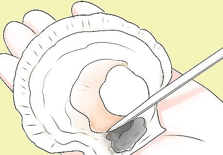 Use your knife to open the scallop shell. Hold the scallop with your left hand (left-handed people, use your right hand) and use the tip of the knife to pry the top and bottom halves of the scallop's shell open. If the valve is completely shut, penetrate the shell near its hinge for an easier entry.
