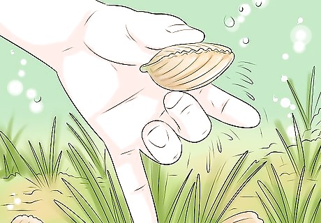 Grab the scallops with your hand or a small net. Scoop the into your mesh bag and keep going until you tire out, run out of scallops in that area, or reach your daily catch limit. Don't let the scallops clamp down their shells and pinch your fingers! Prevent this by picking up the scallop from the back. Scallops move around by opening and closing their shells in an undulating fashion. While they do not move very quickly, they may see your hand or net approaching and try to swim away.